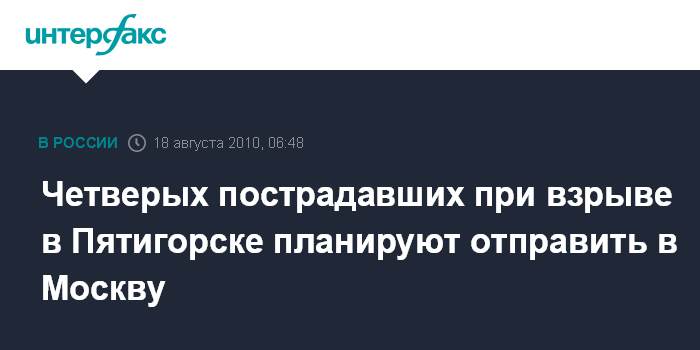"Уже в ближайшие часы самолетом МЧС России четверых раненых во время взрыва в Пятигорске планируется отправить на лечение в Москву", - сообщили агентству "Интерфакс-Юг" в Центральной городской больнице Пятигорска в среду.