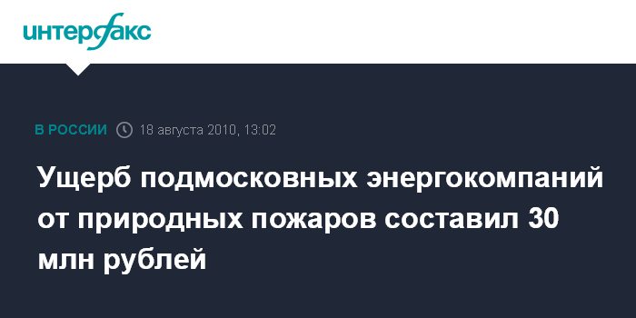 Красногорск. 18 августа. INTERFAX.RU - Энергоущерб электросетям Подмосковья в результате природных пожаров составил порядка 30 млн рублей, сообщил в среду журналистам председатель Топливно-энергетического комитета правительства Московской области Цурен Цагадаев.