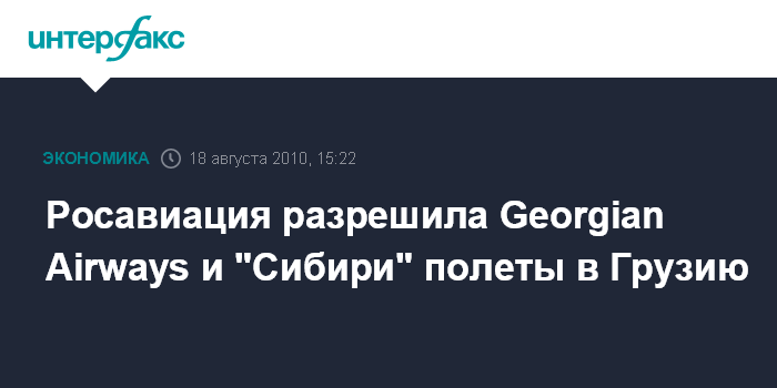 Москва. 18 августа. INTERFAX.RU - Росавиация выдала разрешение ОАО "Авиакомпания "Сибирь" (РТС: AVSI) и грузинской Georgian Airways на выполнение международных полетов по маршруту Москва-Тбилиси-Москва, сообщили "Интерфаксу" в "Сибири".