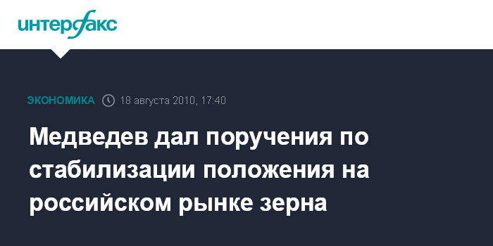 Москва. 18 августа. INTERFAX.RU - Президент России Дмитрий Медведев утвердил перечень поручений по итогам совещания о мерах по стабилизации положения на внутреннем зерновом рынке от 12 августа, сообщила пресс-служба Кремля.