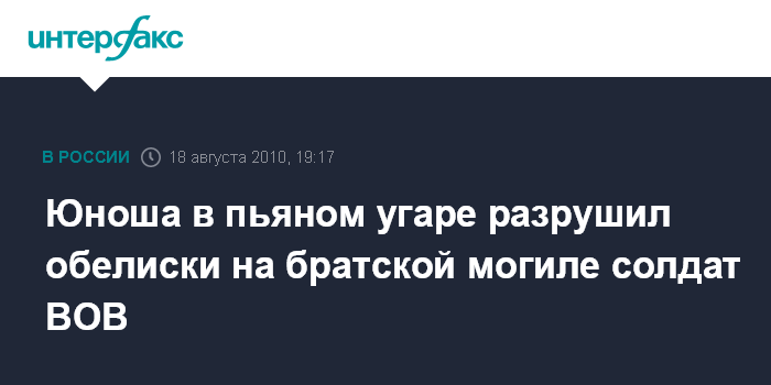 МОСКВА. 18 августа. INTERFAX.RU - В украинском селе Кодня (расположено в 15 км от Житомира) ранее судимый 19-летний юноша в пьяном угаре разрушил четыре обелиска на братской могиле советских солдат, погибших в годы Великой Отечественной войны.