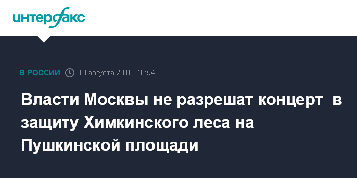 Москва. 19 августа. ИНТЕРФАКС - Правительство Москвы не разрешит защитникам Химкинского леса провести концерт 22 августа на Пушкинской площади.