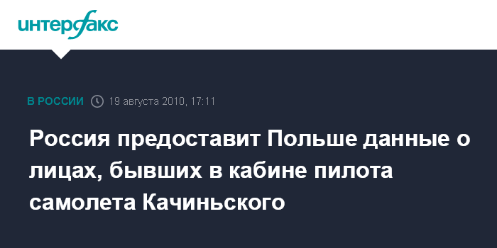 Москва. 19 августа. INTERFAX.RU - СКП РФ передаст польской стороне заключения экспертиз, которые позволят четко определить круг лиц, находившихся в кабине пилота Ту-154 президента Польши Леха Качиньского, разбившегося под Смоленском 10 апреля.