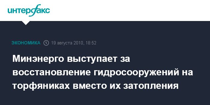 Москва. 19 августа. ИНТЕРФАКС - Министерство энергетики РФ считает более оптимальным восстановление мелиоративных сооружений на брошенных торфяных разработках вместо их затопления, говорится в сообщении Минэнерго.