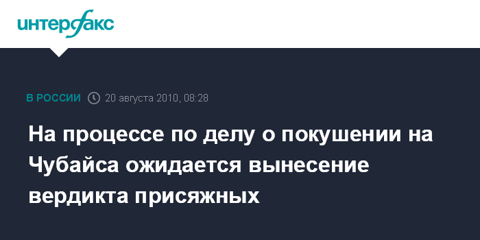 Москва. 20 августа. INTERFAX.RU - Присяжные Мособлсуда в пятницу приступят к вынесению вердикта по делу о покушении на Анатолия Чубайса, совершенном в 2005 году в Подмосковье.