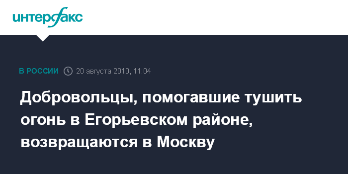 Москва. 20 августа. INTERFAX.RU – Добровольческие отряды, помогавшие местной администрации, МЧС РФ и пожарным бороться с огнем в Егорьевском районе, возвращаются в Москву.