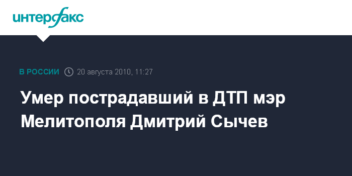 Москва. 20 августа. INTERFAX.RU - В Запорожской областной клинической больнице 20 августа в 7.00 скончался мэр Мелитополя Дмитрий Сычев, пострадавший в ДТП, сообщает официальный веб-портал Мелитополя.