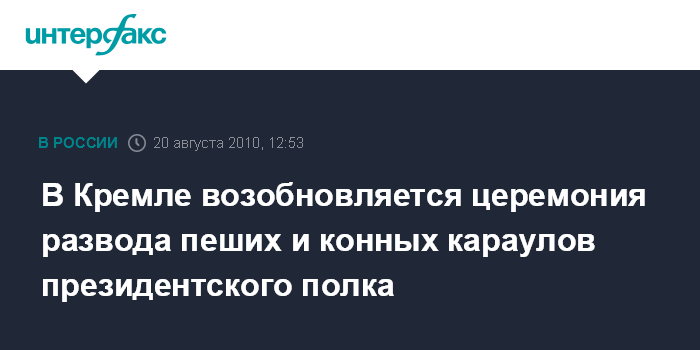 Москва. 20 августа. INTERFAX.RU - В Кремле в ближайшую субботу после перерыва, связанного с аномальной жарой в московском регионе, возобновляется церемония развода пеших и конных караулов президентского полка.