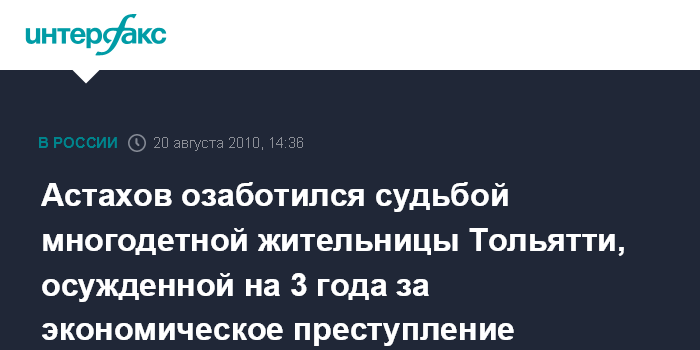 Самара. 20 августа. INTERFAX.RU - Уполномоченный при президенте РФ по правам ребенка Павел Астахов выступил с заявлением в связи с решением тольяттинского суда, который приговорил за экономическое преступление беременную многодетную мать четырех детей к реальному сроку заключения.