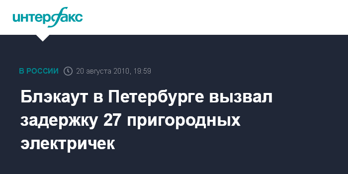 Москва. 20 августа. INTERFAX.RU - 27 пригородных электричек задержаны из-за блэкаута в Санкт-Петербурге в пятницу: 15 - на выборгском и 12 - на сосновском направлении, сообщила пресс-служба ОАО "Российские железные дороги" (РЖД).