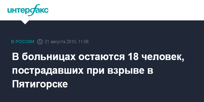Ростов-на-Дону. 21 августа. INTERFAX.RU - На стационарном лечении в больницах Пятигорска, Ставрополя и клиниках Москвы находятся 18 пострадавших во время взрыва в Пятигорске 17 августа, сообщили агентству "Интерфакс - Юг" в медицинских кругах региона. "На сегодняшний день в клиниках Москвы находятся на стационарном лечении четверо пострадавших при взрыве в Пятигорске, один пострадавший госпитализирован в краевую больницу Ставрополя, еще 13 находятся на лечении в Пятигорске", - сказал собеседник агентства.