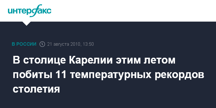 Петрозаводск. 21 августа. INTERFAX.RU - В Петрозаводске в течение июля и августа абсолютный максимум температур был превышен 11 раз, сообщили "Интерфаксу" в Карельском центре по гидрометеорологии и мониторингу окружающей среды. По словам собеседника агентства, нынешний период жаркой погоды стал самым продолжительным за 100 лет метеонаблюдений на территории республики, примыкающей к полярному кругу.