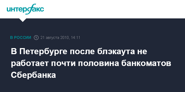 Санкт-Петербург. 21 августа. INTERFAX.RU - Часть банкоматной сети Северо-Западного банка Сбербанка РФ в Петербурге в субботу остается отключенной после сбоя в системе энергоснабжения города. Сбой в энергоснабжении затронул порядка 40% банкоматов банка, сообщили "Интерфаксу" в пресс-службе Сбербанка. "Проблема не является системной, все выключенные банкоматы после отключения электричества необходимо заново запускать. Планируется включить все банкоматы к 15:00 мск", - сказал представитель банка.