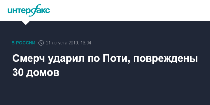 Тбилиси. 21 августа. INTERFAX.RU - Внезапно возникший смерч в субботу нанес ущерб грузинскому городу Поти. Смерч продолжался около пяти минут. По предварительным данным, повреждено около 30 жилых домов, повалены деревья, сообщают грузинские СМИ. Создана специальная комиссия, которая подсчитает нанесенный городу ущерб. Местные власти обещают выплатить компенсацию пострадавшим горожанам из резервного фонда мэрии.