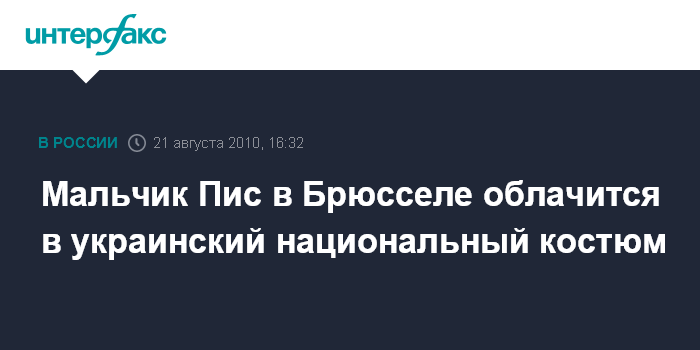 Киев. 21 августа. INTERFAX.RU - Символ Брюсселя - скульптуру Manneken Pis ("писающий мальчик") - на День Независимости Украины, отмечаемый 24 августа, переоденут в украинский казацкий костюм. Как сообщил один из организаторов акции, автор проекта "парк Киевская Русь" Владимир Янченко, идея празднования Дня Независимости в столице Европейского Союза Брюсселе подтверждает, что Киев является культурным и политическим центром Европы так же, как Брюссель является столицей современного Евросоюза.