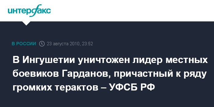 Назрань. 23 августа. ИНТЕРФАКС - ЮГ - В ходе спецоперации в одном из муниципальных округов Назрани уничтожен лидер ингушского бандподполья Илез Гарданов и трое его подельников, сообщили агентству "Интерфакс-Юг " в пресс-службе Управления ФСБ по Ингушетии.