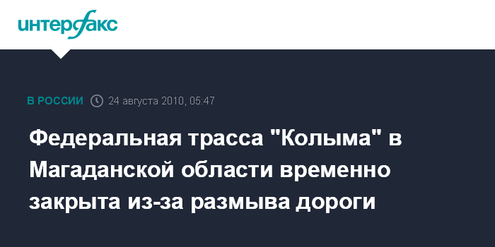 Магадан. 24 августа. ИНТЕРФАКС-ДАЛЬНИЙ ВОСТОК - Мощные продолжительные ливни в Магаданской области сразу в нескольких местах размыли дорогу федерального значения "Колыма", из-за чего трасса временно закрыта.