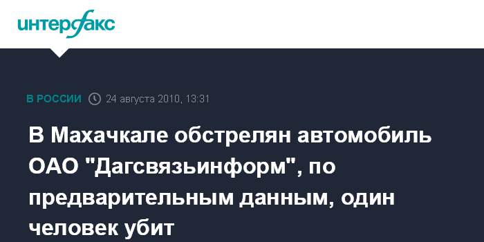 Махачкала. 24 августа. INTERFAX.RU - Неизвестные преступники обстреляли в Махачкале автомобиль "Волга", принадлежащий ОАО "Дагсвязьинформ", в котором находились двое сотрудников организации.