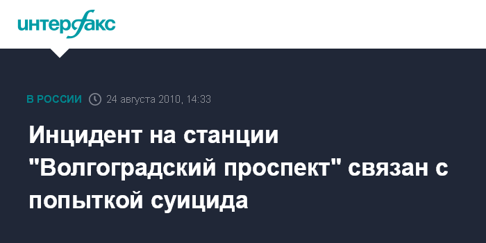Москва. 24 августа. INTERFAX.RU - Мужчина, упавший под поезд на станции метро "Волгоградский проспект", совершил попытку суицида, сообщил "Интерфаксу" руководитель пресс-службы управления милиции на Московском метрополитене Алексей Мышляев.