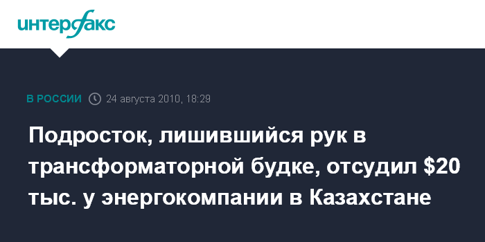 Караганда. 24 августа. INTERFAX.RU - Районный суд в Караганде (Казахстан) обязал местную энергокомпанию "Караганды Жарык" выплатить 14-летнему подростку 3 млн тенге (147,2/$1).
