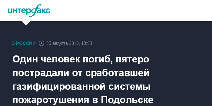 Москва. 25 августа. INTERFAX.RU - В Подмосковном Подольске в административном здании, расположенном на Ленинградской улице, сработала автоматическая газифицированная система пожаротушения, в результате погибла женщина, пять человек пострадали, сообщили "Интерфаксу" в пресс-службе главного управления МЧС по Московской области.