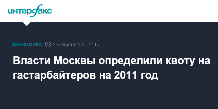 Москва. 25 августа. INTERFAX.RU - Квота на иностранную рабочую силу в Москве на 2011 год составит 200 тыс. человек, сообщил на пресс-конференции руководитель столичного департамента занятости населения Олег Нетеребский в среду.