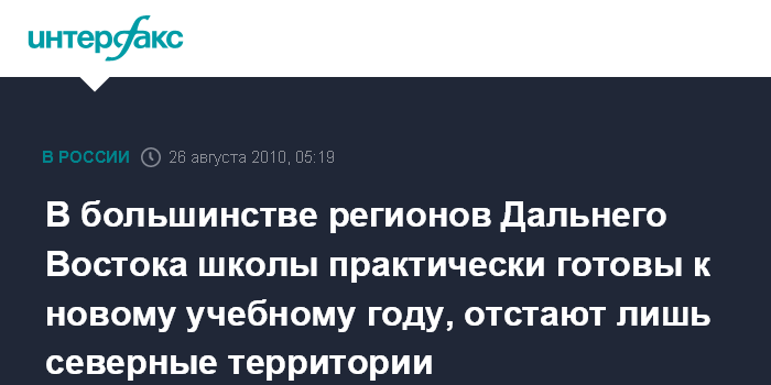Как сообщает пресс-служба аппарата полпреда президента РФ, в настоящее время готовность общеобразовательных школ к приему учеников составляет 92,5%. Полностью (100%) школ готовы к работе в Еврейской автономной области, практически закончена подготовка школ в Приморском крае - 99,7% , Амурской области - 99,3%, Сахалинской области - 98,9%, Камчатском крае - 98,5%, Хабаровском крае - 99%, Магаданской области - 95,4%.
