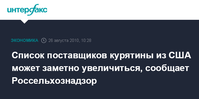 Москва. 26 августа. INTERFAX.RU - Число поставщиков мяса птицы из США до конца этой недели может заметно увеличиться, заявили "Интерфаксу" в Россельхознадзоре.