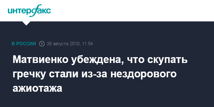 Санкт-Петербург. 26 августа. INTERFAX.RU - Губернатор Петербурга Валентина Матвиенко уверена, что причиной повышенного интереса горожан к гречневой крупе стал нездоровый ажиотаж.
