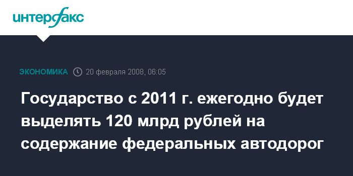 Москва. 20 февраля. INTERFAX.RU - Государство с 2011 года ежегодно будет выделять 120 млрд рублей на содержание федеральных автодорог, сообщил журналистам министр транспорта Игорь Левитин.