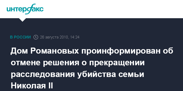 Москва. 26 августа. INTERFAX.RU - В Российском доме Романовых довольны решением Басманного суда Москвы, который отменил в четверг решение о прекращении расследования уголовного дела об убийстве последнего российского императора Николая II и его семьи.
