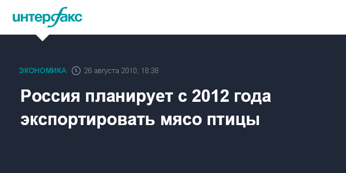 Ярославль. 26 августа. INTERFAX.RU - Россия намерена постепенно наращивать объемы производства мяса птицы, а с 2012 года планирует начать его экспорт, заявил заместитель министра сельского хозяйства РФ Александр Беляев в четверг на брифинге после открытия I ярославской агропромышленной выставки "ЯрАГРО".