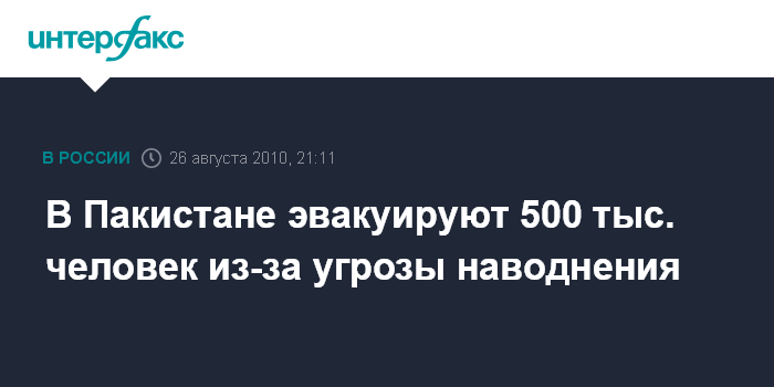 Вашингтон. 26 августа. INTERFAX.RU - Правительство Пакистана в четверг предупредило около 500 тысяч жителей юго-западной провинции Синд, что они должны немедленно эвакуироваться из-за возможности нового наводнения, сообщает американская телекомпания CNN.