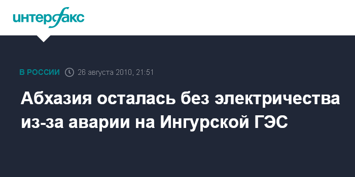 Как передает корреспондент "Интерфакса", из-за аварии на Ингурской ГЭС в Гальском районе Абхазии с 18:00 мск была обесточена вся республика. Из-за этого оказались сорванными все праздничные мероприятия, посвященные второй годовщине признания независимости Абхазии.