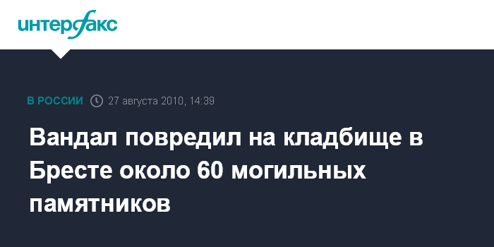 Минск. 27 августа. INTERFAX.RU - Милиция ведет поиск злоумышленника, который повредил на кладбище в Бресте около 60 могильных памятников, сообщили агентству "Интерфакс" в пятницу в УВД Брестской области.