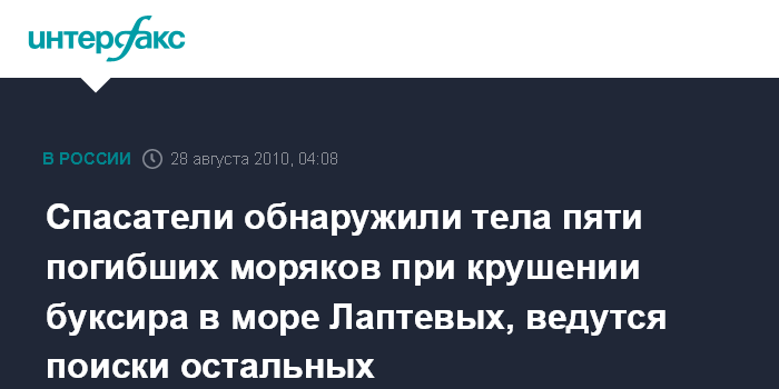 Хабаровск. 28 августа. ИНТЕРФАКС - ДАЛЬНИЙ ВОСТОК - В настоящее время в районе крушения буксира "Алексей Кулаковский" ведутся поиски шести моряков, ранее спасатели обнаружили тела пяти погибших.