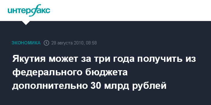 Якутск. 28 августа. ИНТЕРФАКС-АФИ - Республика Саха (Якутия) может получить из федерального бюджета дополнительно 10 млрд рублей ежегодно с 2011 по 2013 гг. на строительство инфраструктурных объектов федерального значения, сообщил вице-премьер - министр финансов РФ Алексей Кудрин журналистам в Якутске.