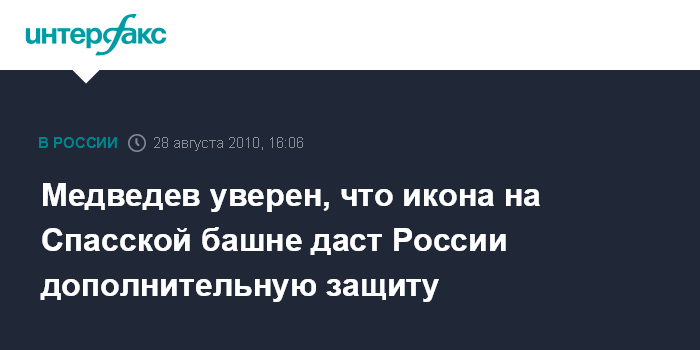 Москва. 28 августа. INTERFAX.RU - Президент РФ Дмитрий Медведев уверен, что с восстановлением икон на башнях Кремля Россия и ее народ получает дополнительную защиту. Выступая на Красной площади после освящения на Спасской башне Московского Кремля иконы Спаса Смоленского, глава государства поблагодарил всех, кто помог в сохранении и восстановлении этой иконы. Президент считает, что "в сегодняшнем событии есть особый смысл, в частности, в единении церкви с народом". "Уверен, с момента восстановления икон наша страна получает дополнительную защиту", - заявил Д.Медведев.