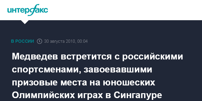 Москва. 30 августа. ИНТЕРФАКС - Президент РФ Дмитрий Медведев встретится в понедельник с членами российской юношеской сборной, завоевавшей второе место в общекомандном зачете на первых юношеских Олимпийских играх в Сингапуре.