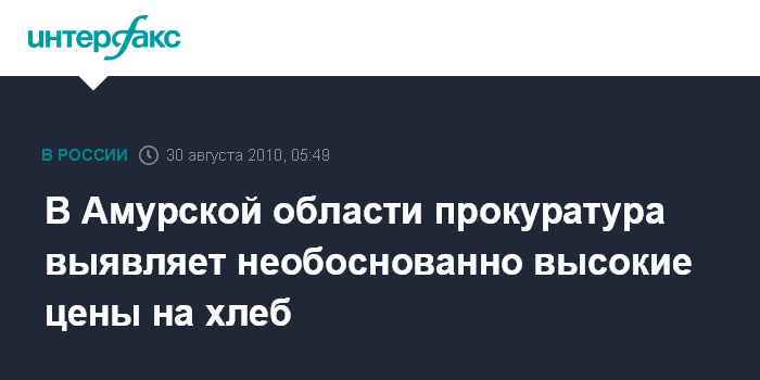 Хабаровск. 30 августа. ИНТЕРФАКС - ДАЛЬНИЙ ВОСТОК - Прокуратура Амурской области выявила необоснованный рост цен на хлеб в городах Тында и Белогорск, рост стоимости хлебобулочных изделий и хлеба достигает 46%.