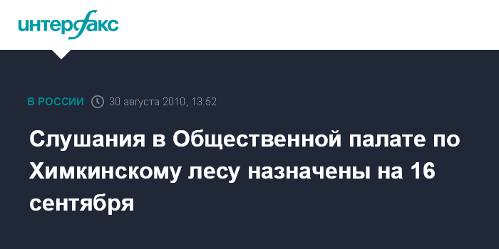 Москва. 30 августа. INTERFAX.RU - Общественная палата Российской Федерации проведет 16 сентября слушания "Химкинский лес - проблемы и решения", сообщили "Интерфаксу" в пресс-службе Общественной палаты.