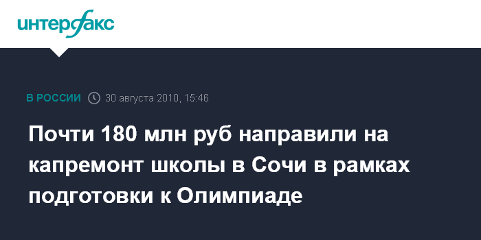 Сочи. 30 августа. INTERFAX.RU - В поселке Дагомыс Сочи строители завершили капитальный ремонт школы N 82 в рамках реализации целевой краевой программы "Обеспечение строительства олимпийских объектов и развитие города Сочи как горноклиматического и бальнеологического курорта".