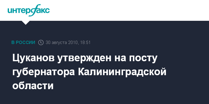 Калининград. 30 августа. INTERFAX.RU - Депутаты Калининградской областной Думы на внеочередном заседании в понедельник утвердили кандидатуру Николая Цуканова на должность нового губернатора региона, передает корреспондент "Интерфакса".