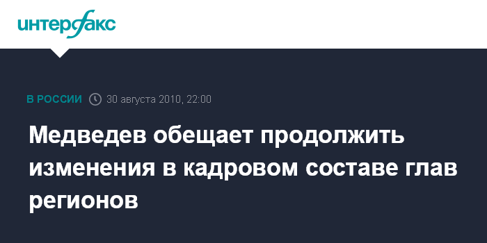 Москва. 30 августа. INTERFAX.RU - Президент РФ Дмитрий Медведев заявил, что продолжит работу по обновлению губернаторского корпуса.