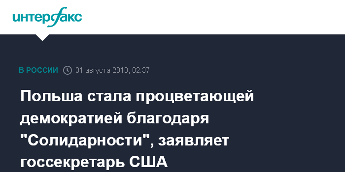 Вашингтон. 31 августа. ИНТЕРФАКС - Государственный секретарь США Хиллари Клинтон выступила с заявлением по случаю 30-летия основания польского движения "Солидарность", сообщает госдеп США.