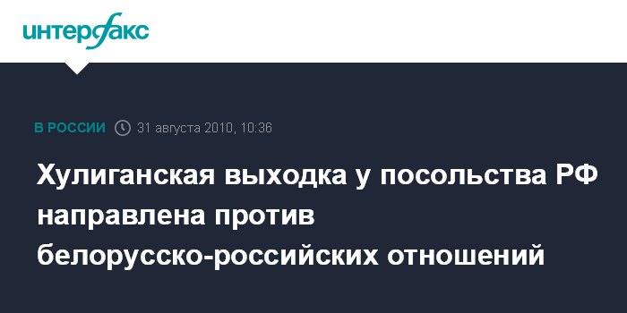 Минск. 31 августа. INTERFAX.RU - МИД Белоруссии считает инцидент с посольством РФ хулиганской выходкой, направленной против белорусско-российских отношений.