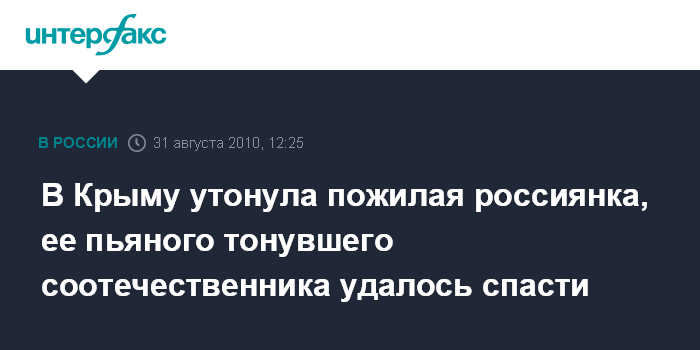 Симферополь. 31 августа. INTERFAX.RU - В Евпатории при купании в море утонула 79-летняя россиянка, еще одного пьяного 61-летнего гражданина России, тонувшего в пруду в Бахчисарайском районе, удалось спасти.