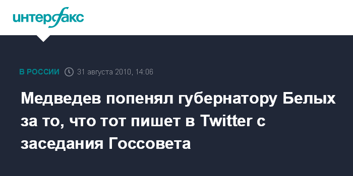 Москва. 31 августа. INTERFAX.RU - Президент РФ Дмитрий Медведев продемонстрировал, что является активным пользователем Twitter, попеняв губернатору Кировской области Никите Белых за переписку в этой системе в рабочее время.