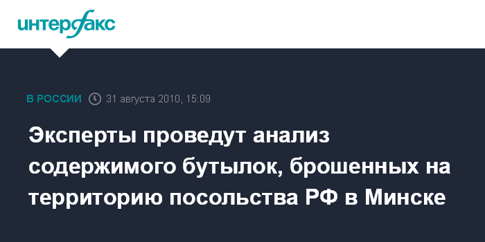 Минск. 31 августа. INTERFAX.RU - Эксперты проведут анализ содержимого бутылок, брошенных злоумышленниками на территорию российского посольства вечером 30 августа, сообщили агентству "Интерфакс" во вторник в правоохранительных органах.