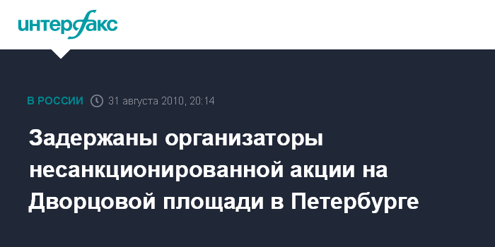 Санкт-Петербург. 31 августа. INTERFAX.RU - Петербургская милиция задержала организаторов несанкционированной акции оппозиции на Дворцовой площади, передает корреспондент "Интерфакса".